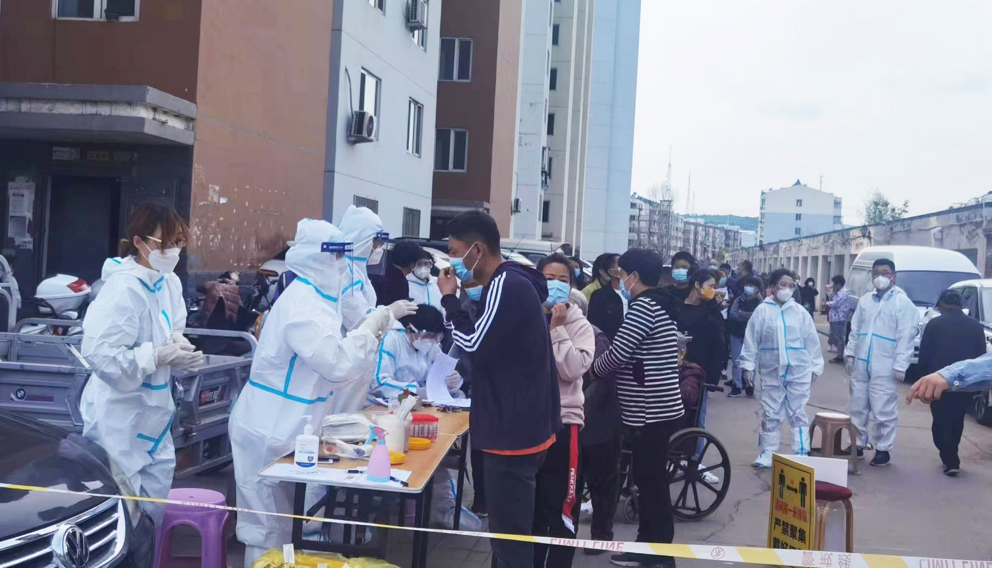 “穿上防護(hù)服成為‘大白’,感到非常光榮,也感到責(zé)任重大?!苯诔械職鉁厣?,集團(tuán)公司許平凡、紀(jì)哲負(fù)責(zé)維護(hù)秩序、信息錄入,每天穿著密不透風(fēng)的防護(hù)服、戴著醫(yī)用口罩及手套,里面衣服被汗水浸透,手被捂得發(fā)白,鼻梁被口罩壓出瘀痕,平時顯得厚實的腳套,每天都被磨破兩三雙,一刻不停的指揮居民排隊,逐樓的通知居民下樓核酸,嗓子都喊啞了,也從沒有喊過累。