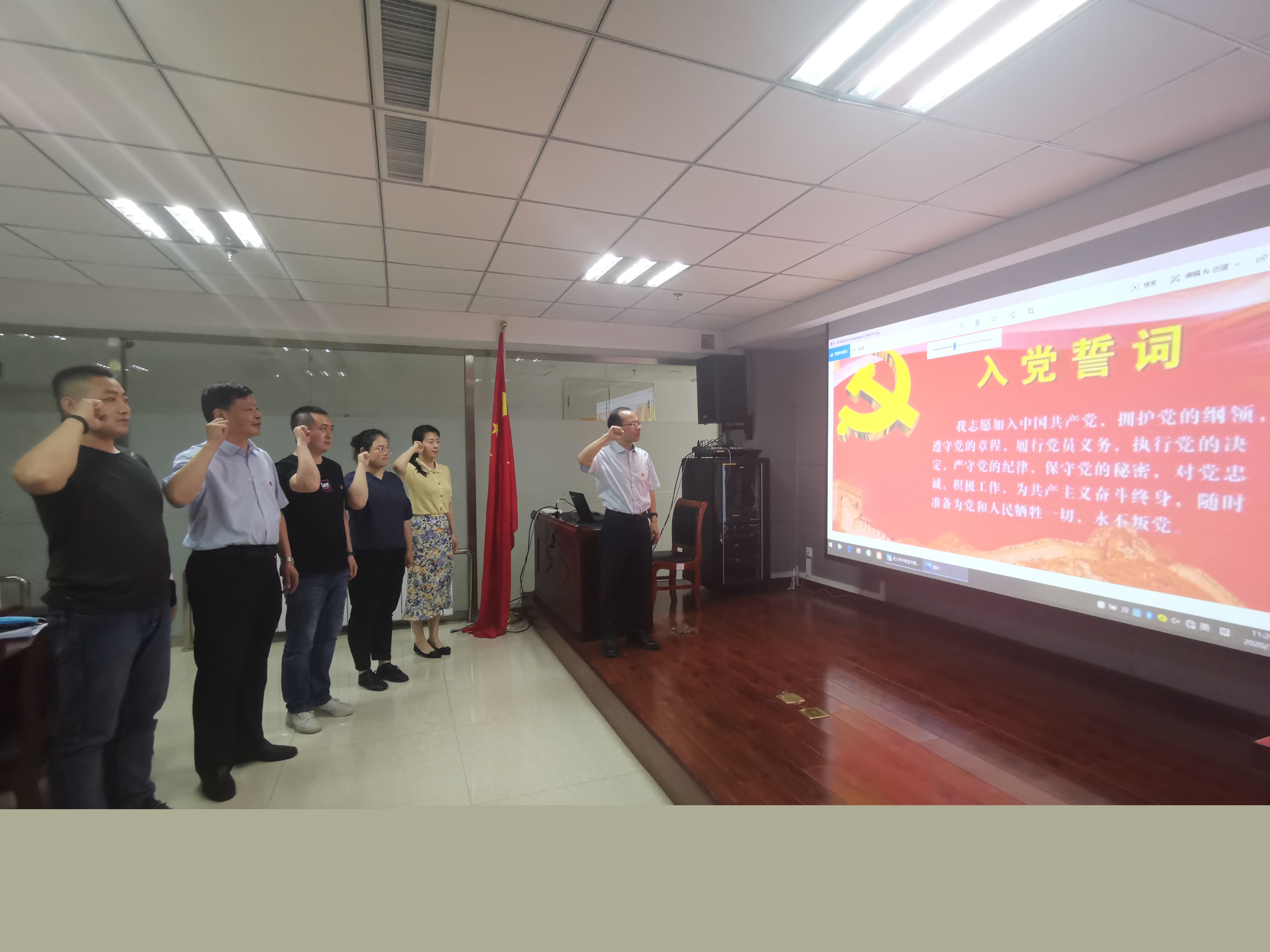 由黨支部書記焦俊良同志領(lǐng)誓,全體黨員面對鮮紅的黨旗,舉起右拳,莊嚴宣誓?!拔倚模何抑驹讣尤胫袊伯a(chǎn)黨,擁護黨的綱領(lǐng),遵守黨的章程,履行黨員義務,執(zhí)行黨的決定,嚴守黨的紀律,保守黨的秘密,對黨忠誠,積極工作,為共產(chǎn)主義奮斗終身,隨時準備為黨和人民犧牲一切,永不叛黨?!辩H鏘有力的誓言,讓每名黨員受到了一次深刻的黨性教育和政治靈魂洗禮。