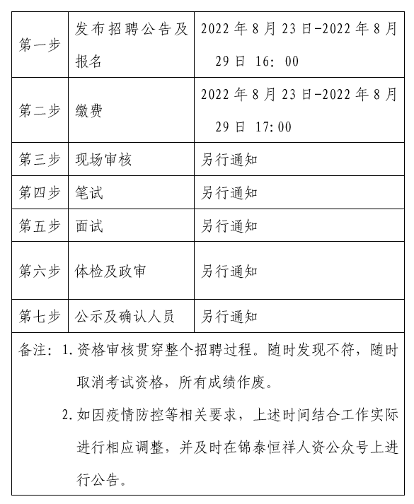 ?2022年8月23日-2022年8月29日 16:00在錦泰恒祥人資官網(www.jthxhr.com)、“錦泰恒祥人資”微信公眾號、“國控集團”官方網站(m.hfzlsm.com)及上級部門要求的相關網站等發(fā)布招聘公告。