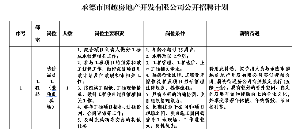 本次擬招聘1個崗位共計1人。具體應聘條件見附件《承德市國越房地產開發(fā)有限公司公開招聘計劃表》 。
